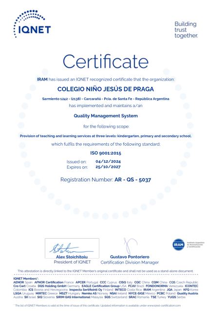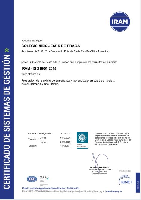 El Colegio Niño Jesús de Praga promueve y desarrolla acciones tendientes a lograr la formación integral a través de la exigencia académica, la mejora continua por medio de la evaluación de los resultados y revisión permanente de los objetivos, para alcanzar la calidad educativa propuesta, la eficacia del sistema de gestión de calidad y la satisfacción de todos los integrantes de la comunidad educativa.